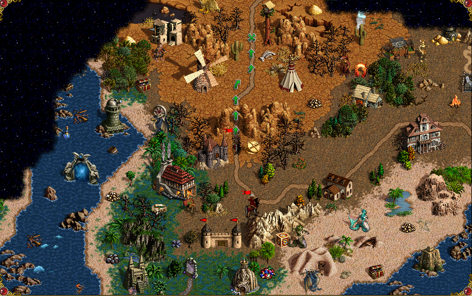 The above picture gives you an impression of the density of events in Heroes III. The green arrows that mark the plotted path of one of the heroes give you an idea how big a tile on the map is. New World Computing, the developer of Heroes III, managed to process a lookahead, technically the limit to which paths are processed, of roughly 75 tiles in each direction.